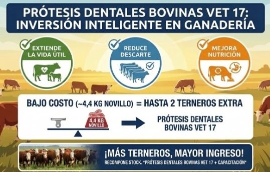 La Prótesis Dental Bovina Vet 17 es una herramienta de manejo productivo que permite extender la vida reproductiva de vientres bovinos con desgaste dentario, mejorar el aprovechamiento del alimento y reducir el descarte prematuro. En el contexto actual de la ganadería argentina, con mejores perspectivas de precios y demanda de exportación, esta tecnología de bajo costo y alto impacto ayuda a incrementar la producción de terneros por vientre, optimizar costos de reposición y mejorar los indicadores productivos en el corto plazo, con foco en bienestar animal y eficiencia del sistema. TAGS: Prótesis dental bovina. Desgaste dentario en vacas. Descarte prematuro de vientres. Eficiencia reproductiva bovina. Recuperación del stock ganadero. Ganadería sustentable. Producción de terneros.