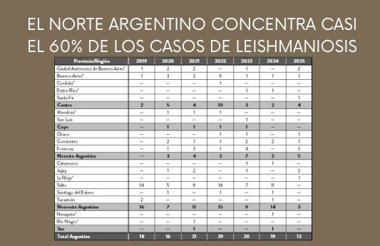 Entre 2019 y 2025 se confirmaron 1.122 casos de leishmaniosis cutánea en Argentina, con una marcada concentración en el norte del país. El 58,6% de los casos se registró en la región NOA, destacándose Salta (426 casos) y Jujuy (188 casos). La región NEA concentró el 36% de las notificaciones, principalmente en Misiones (148 casos) y Chaco (160 casos). El análisis de riesgo mostró transmisión muy intensa en los departamentos de Orán (Salta) y en 2 de abril y General Güemes (Chaco), consolidando a estas zonas como áreas prioritarias para vigilancia y control sanitario. TAGS: Leishmaniosis. Leishmaniosis cutánea. Salud pública. Epidemiología. Una Salud. One Health